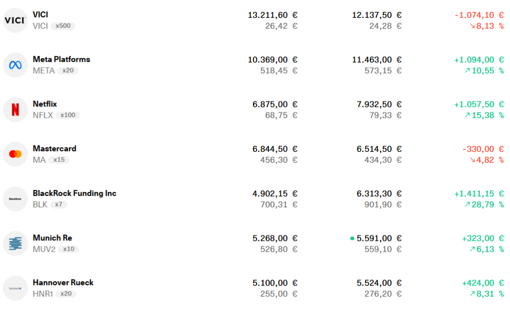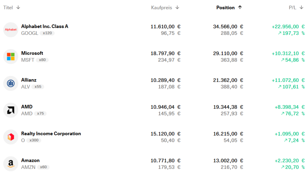 Heute investiere ich nicht mehr nur nach dem Kriterium der reinen Ausschüttung, sondern setze ganz gezielt auf eine ausgewogene Mischung in meinem Depot. In meiner aktuellen Aufstellung finden sich ambitionierte Wachstumsunternehmen wie Alphabet, Microsoft, Amazon, AMD oder Meta in direkter Nachbarschaft zu soliden Dividendenzahlern wie z. B. BlackRock, Realty Income, Allianz, und BAT. Diese Kombination erlaubt es mir, das Beste aus zwei Welten zu vereinen und von den jeweiligen spezifischen Vorteilen beider Anlageklassen zu profitieren.